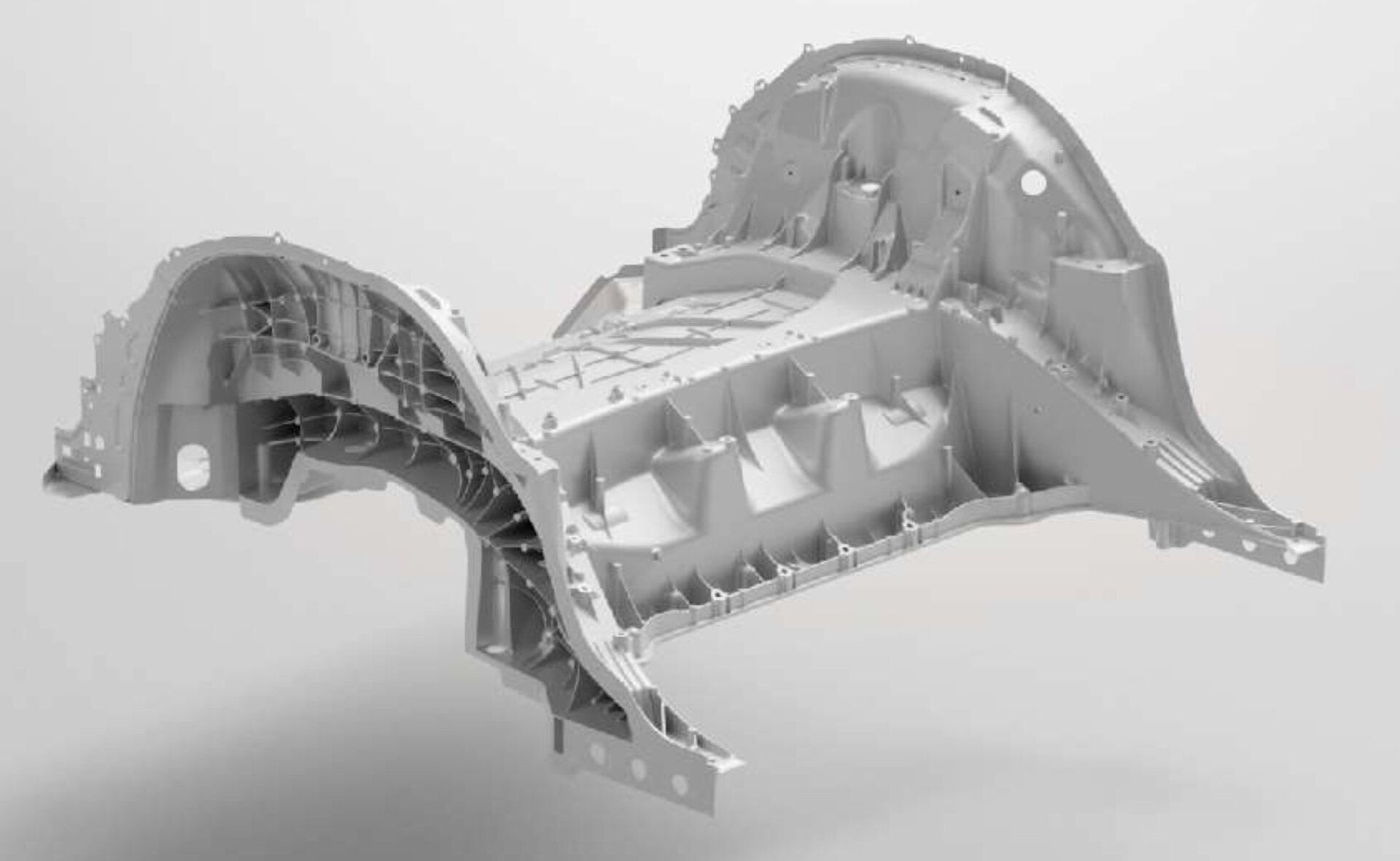 These parts could be more efficiently replaced by stamped metal sheets for weight reduction but integrating them in the Megacasting design reduces assembly processes of the vehicle underbody in the by over 30%.